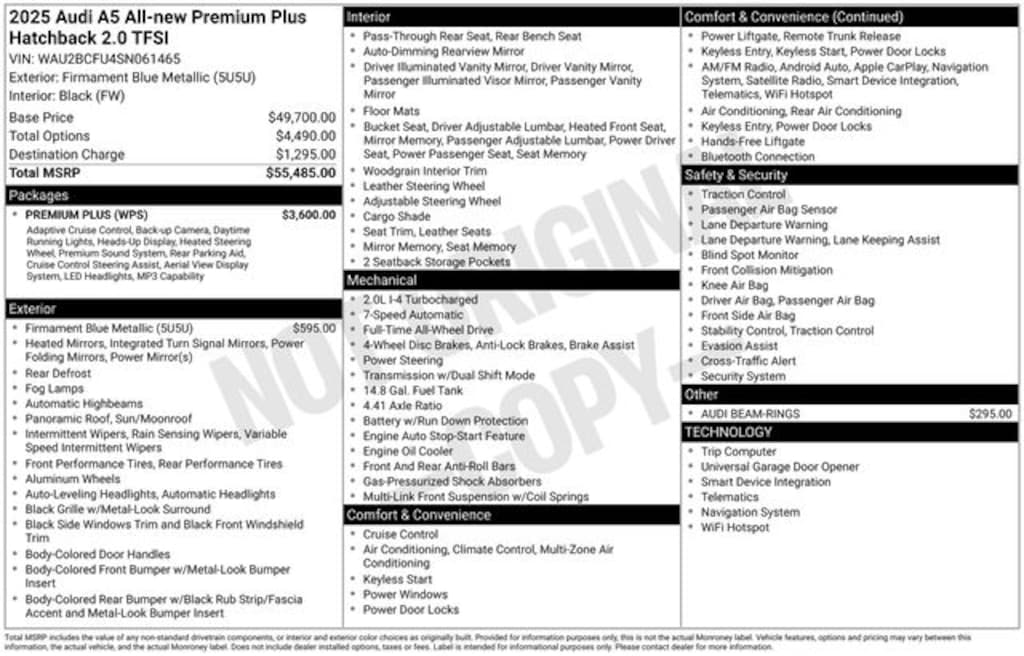 Just arrived, this beautiful deep blue metallic exterior paint, 2025 Audi A5 Quattro all-wheel-drive INCLUDING the Premium Plus Package $3,600, Audi Beam Rings $295, firmament blue metallic paint $595 as well as Audi Manufacturer Certification which gets you additional warranty coverage at NO EXTRA CHARGE!