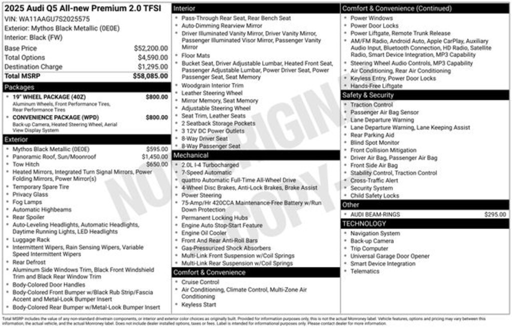 Check out this beautiful 2025 Audi Q5 Quattro with all-wheel-drive, Panoramic Sunroof $1,450, 19" aluminum alloy wheels $800, trailer hitch $650, Convenience Package $800, Audi Beam Rings $295 and Audi Manufacturer Certified which gets you additional manufacturer warranty coverage at NO EXTRA CHARGE! Only 4,790 miles on the odometer!