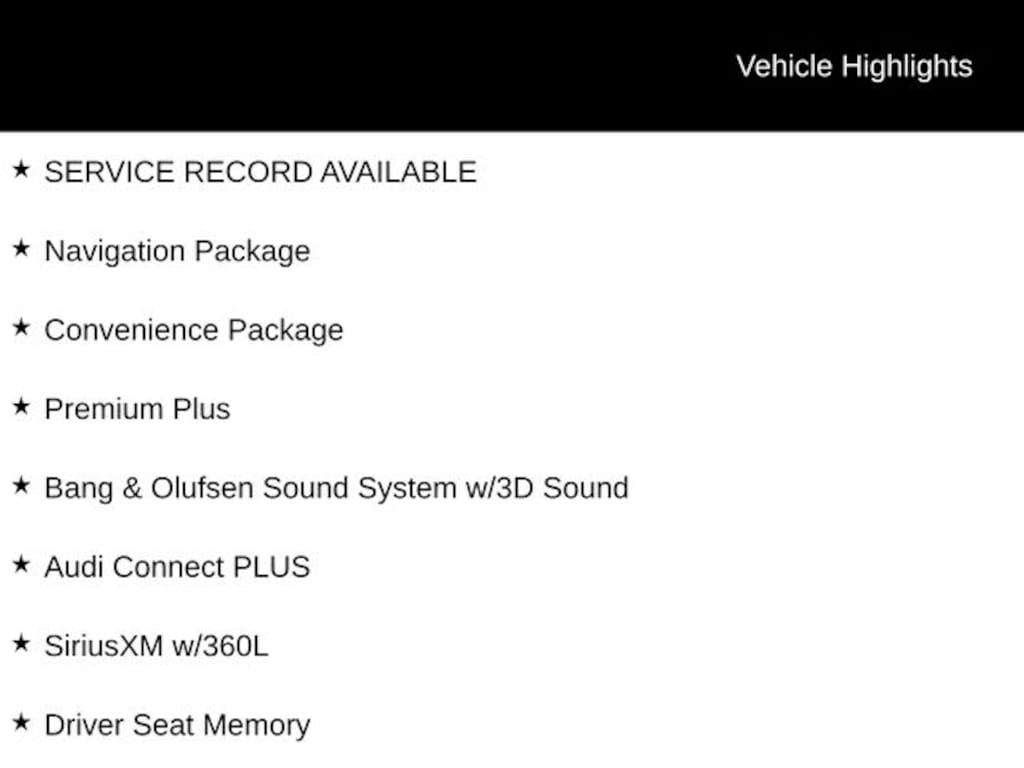 The Premium Plus package takes this Audi to new heights, offering a wealth of advanced features that elevate the driving experience. Enjoy the convenience of the Audi Advanced Key, allowing keyless entry and ignition, as well as the Audi Virtual Cockpit Plus, providing a high-resolution digital instrument cluster. The Bang & Olufsen sound system with 3D sound delivers an immersive audio experience, while the Audi Side Assist with Pre Sense Rear enhances your awareness on the road.