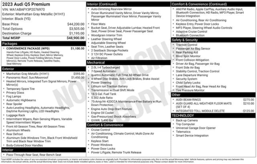 Whether you're navigating the city streets or exploring the open road, this 2023 Audi Q5 40 Premium quattro is the perfect companion. Its blend of style, performance, and premium features make it a truly exceptional value in the luxury SUV segment.