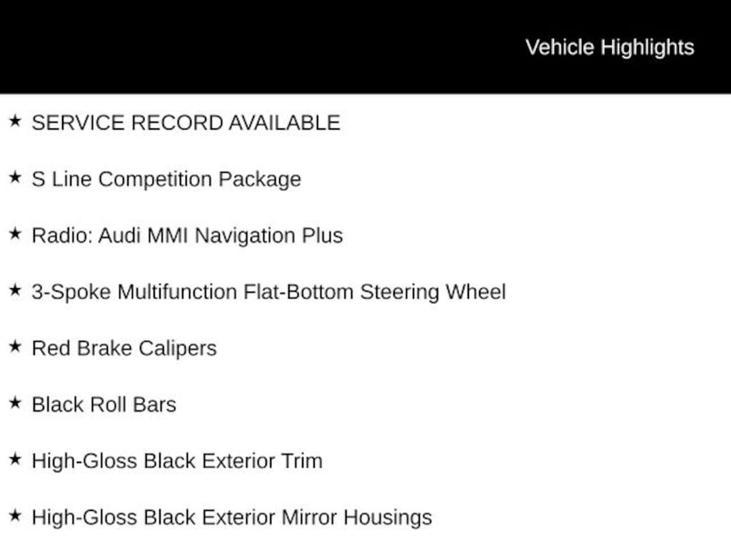 SERVICE RECORD AVAILABLE, 3-Spoke Multifunction Flat-Bottom Steering Wheel, Aluminum S Line Door Sills, Audi Connect, Audi MMI Navigation Plus, Audi Phone Box w/Wireless Charging, Audi Virtual Cockpit, Audi Virtual Cockpit w/Sport Mode, Black Exhaust Tips, Black Roll Bars, Brushed Aluminum Inlays, Heated Front Sport Seats, High Gloss Black Rear Fixed Wing Spoiler, High-Gloss Black Exterior Mirror Housings, High-Gloss Black Exterior Trim, Leather/Alcantara Seat Trim w/S Line Embossing, Radio: Audi MMI Navigation Plus, Red Brake Calipers, S Line Competition Package, S Line Sport Suspension, S Sport Seats, Wheels: 19" Audi Sport 5-Arm-Polygon. Recent Arrival! 23/30 City/Highway MPG