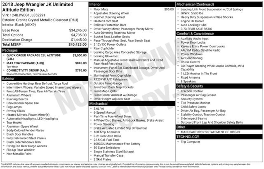 SERVICE RECORD AVAILABLE, 6 Speed Manual!!, 3.73 Rear Axle Ratio, Altitude Package, Black/Chrome Screws Fuel Filler Door, Body Color 3-Piece Hard Top, Body Color Grille w/Black Accents, Class II Receiver Hitch, Connectivity Group, Delete Sahara Badge, Gloss Black Rear Fascia Applique, Glossy Black Jeep Badge, Heated Front Seats, Hood w/Power Bulge, Leather Trimmed Seats, Liquid Titanium Accents, Low Gloss Wrangler JK Decal, Max Tow Package, Millennium Fabric Sport Bar Cover, MOPAR Black Tail Lamp Guards, MOPAR Grab Handles, Quick Order Package 23L Altitude, Tire Pressure Monitoring Display, Trailer Tow w/4-Pin Connector Wiring, Uconnect Voice Command w/Bluetooth, Vehicle Information Center, Wheels: 18" x 7.5" High Gloss Black Polished. 2018 Wrangler JK Unlimited Altitude