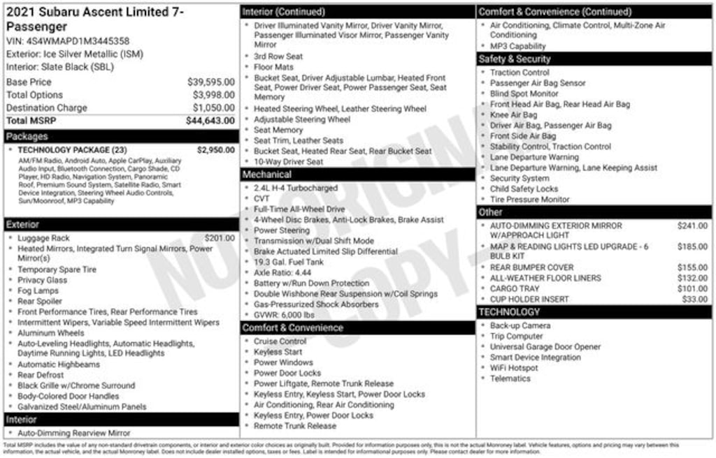 SERVICE RECORD AVAILABLE. 2021 Ascent Limited 20/26 City/Highway MPG