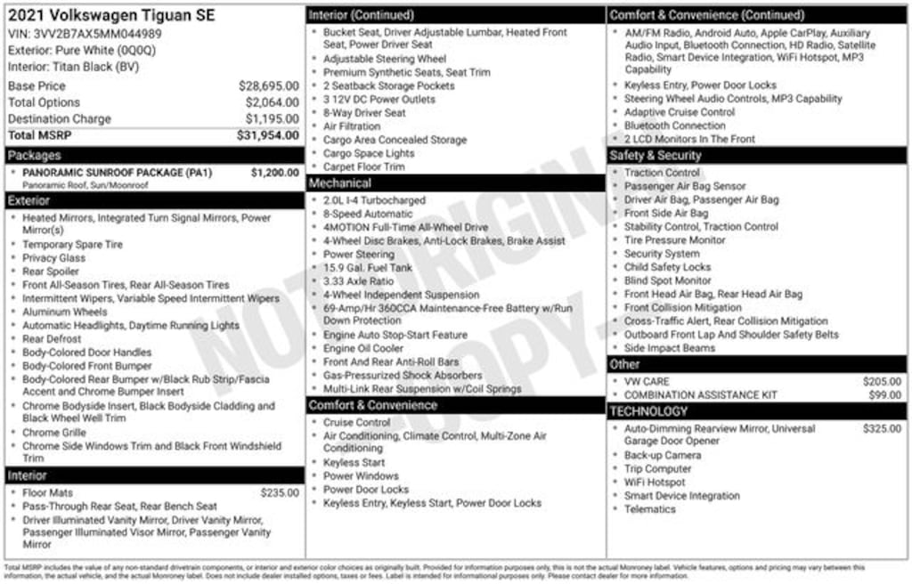 Whether you're navigating the city streets or embarking on weekend adventures, this 2021 Volkswagen Tiguan 2.0T SE is the perfect companion. With its impressive list of features and exceptional value, this SUV is sure to impress. We invite you to schedule a test drive and experience the Tiguan's exceptional capabilities for yourself.